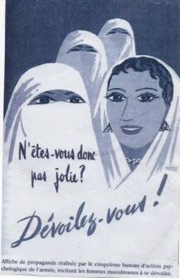 - La diffusion de photographies et d'affiches distribués dans la société colonisé ou dans la presse coloniale, montrant le corps féminin « libéré » comme preuve de la réussite de la colonisation. Ces images participaient à une fétichisation orientaliste de la femme arabe, transformant son corps en symbole exotique et instrument de légitimation coloniale.